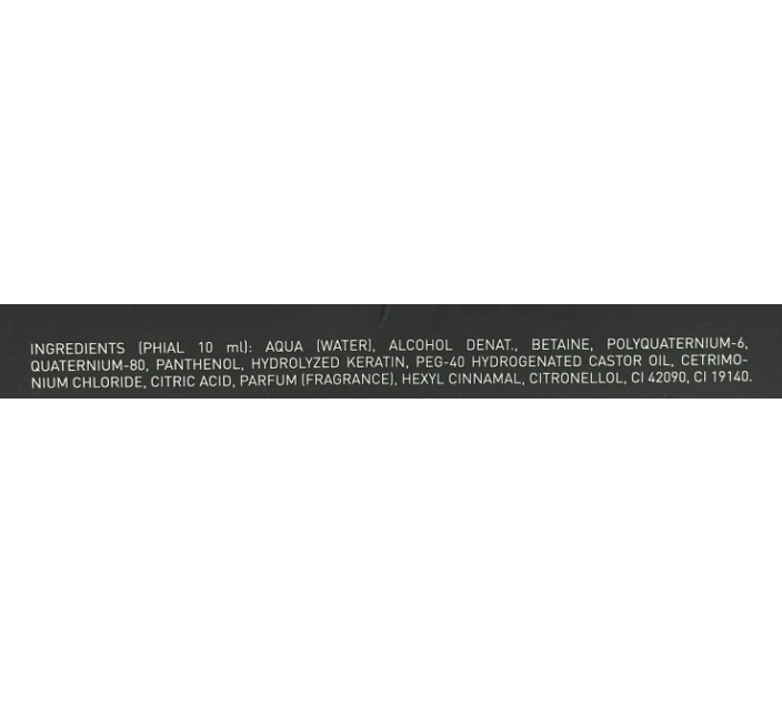Aqua, alcohol denatured, triethanolamine, rna hydrolysata, hydrolyzata keratin, dna hydrolysata, sericum hydrolyticum, eucalyptolum, menthol, acidum glycolicum, acidum tartaricum, acidum malicum, glycol propylene, peg-40 hydrogenatum oleum castoreum, acidum lacticum, acidum citricum, odorem, linalool, hexyl cinnamal, citronellol, CI 16255, CI 19140.