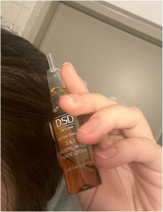 - Нанесите 2–4 мл (примерно треть ампулы) на сухую или слегка влажную кожу головы, распределяя по проборам.
