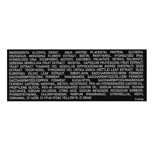 Спирт денатурированный, вода, плацентарный экстракт, экстракт боярышника, биотин, пантенол, гидролизат РНК, гидролизат ДНК, токоферола ацетат, аскорбил пальмитат, ретинил пальмитат, экстракт плодов карликовой пальмы, инозитол, экстракт кайенского (чили) перца, экстракт дрожжей, тиамин, экстракт конского каштана, токоферол, пиридоксин, экстракт листьев крапивы двудомной, экстракт листьев оливы европейской, рибофлавин, ферментированные сахаромицетами микроэлементы (железо, медь, магний, кремний, цинк), никотинамид, эвкалиптол, кофеин, ментол, метилникотинат, PEG-40 гидрогенизированное касторовое масло, пропиленгликоль, PEG-60 гидрогенизированное касторовое масло, гидроксид натрия, сукцинат натрия, хлорид натрия, лимонная кислота, бензоат натрия, сорбат калия, феноксиэтанол, хлорфенезин, отдушка, цитронеллол, гексилкоричный альдегид, CI 16255, CI 19140, CI 28440.